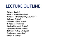 The document outlines a comprehensive overview of software quality, quality assurance, and testing methodologies, emphasizing definitions and goals related to software testing processes. It includes different types of testing, the software testing life cycle, and the roles of development, release, and user testing. Furthermore, it distinguishes between static and dynamic testing while discussing various testing stages to ensure software quality and functionality.
