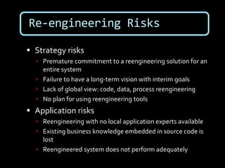 Software re-engineering involves examining, analyzing, and altering an existing software system to reconstitute it in a new form to improve maintainability and reliability. It occurs at both the business and software levels through approaches like big bang, incremental, or evolutionary. Risks include issues with tools, processes, applications, technology, strategies, and personnel.
