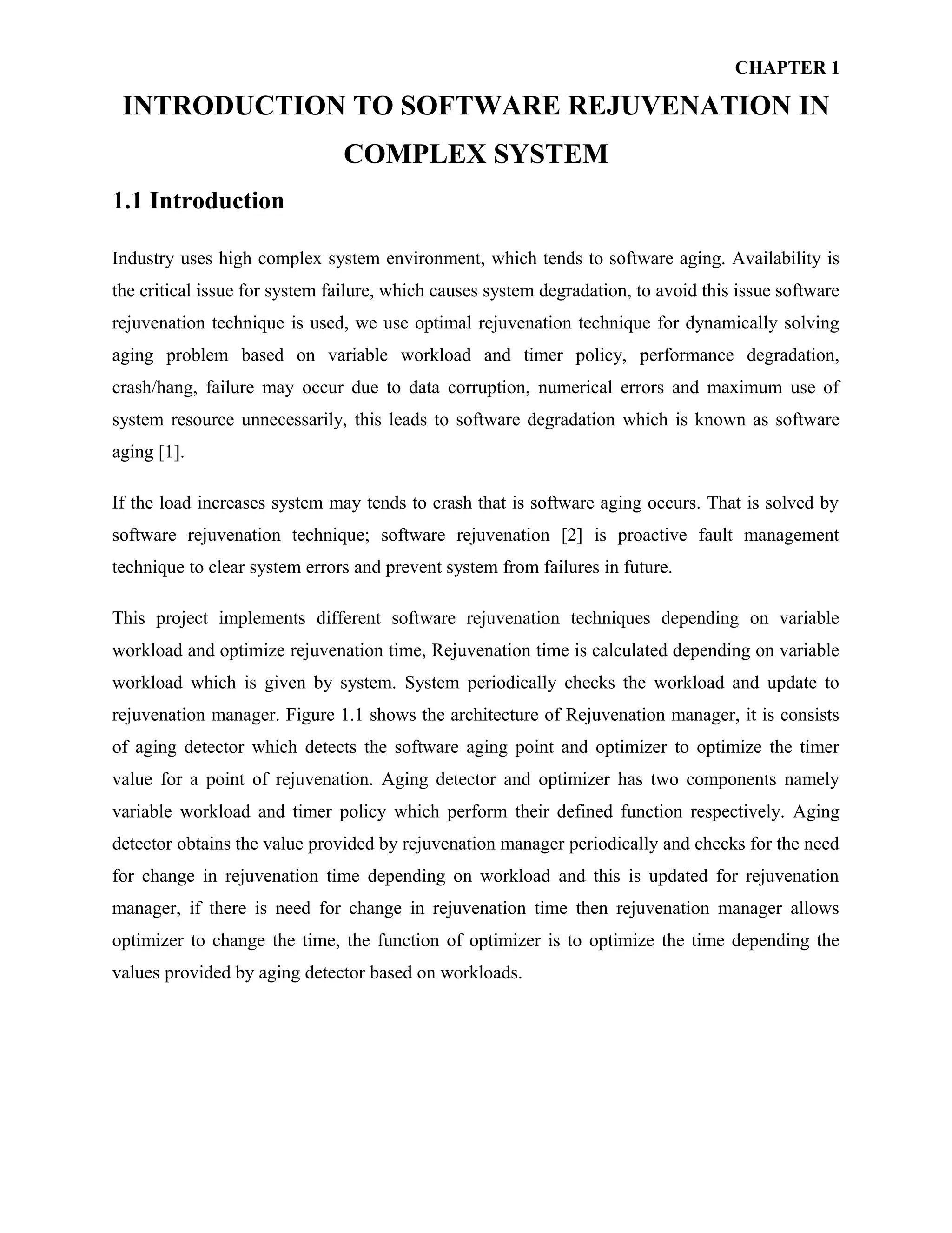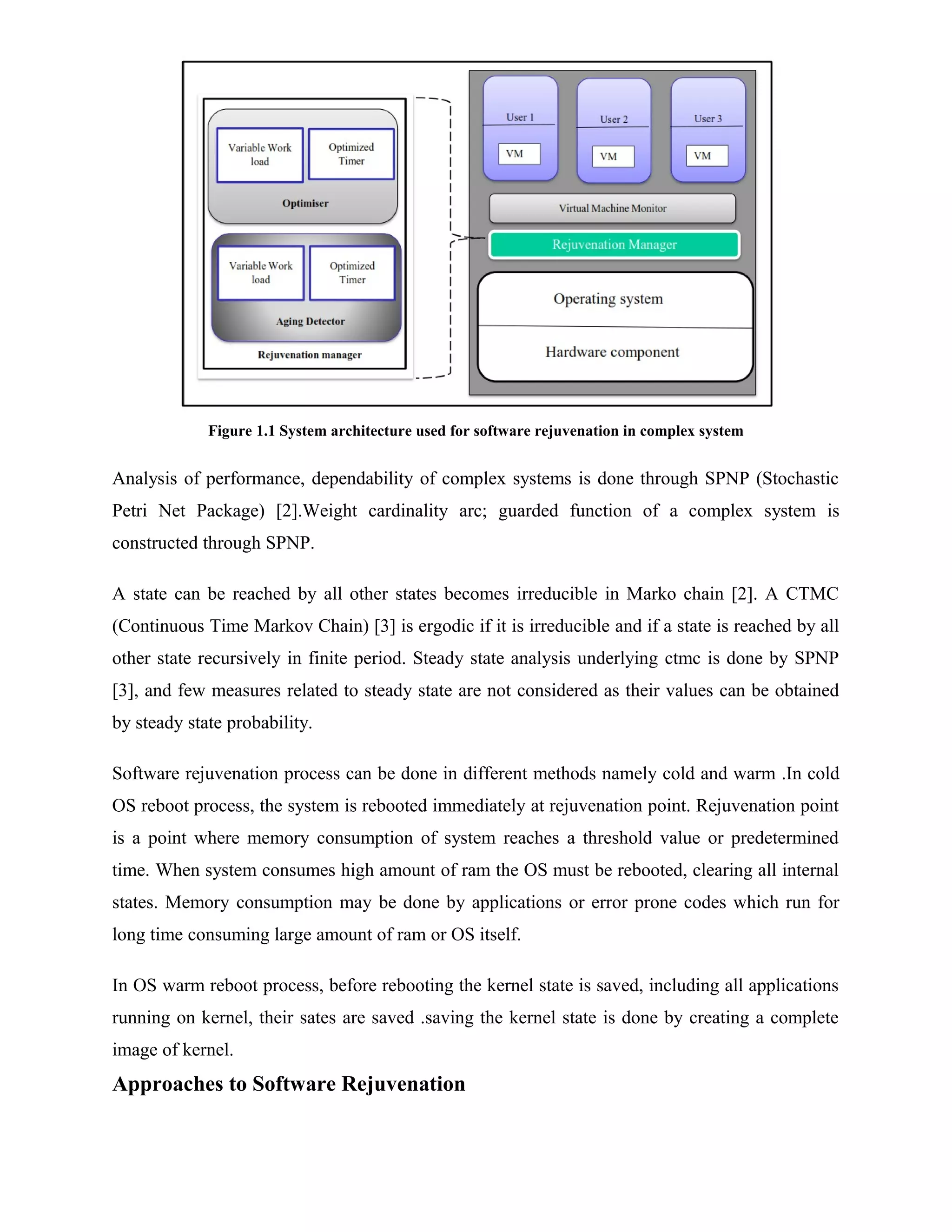This document introduces software rejuvenation techniques for complex systems. It discusses how software aging can degrade system performance over time due to resource exhaustion and error accumulation. Software rejuvenation proactively reboots systems to clear internal states and prevent failures. The document compares different rejuvenation policies and techniques like cold, warm, and migrate VM rejuvenation. It also outlines modeling tools like SPNP and POMDP used to analyze system dependability and optimize rejuvenation scheduling based on variable workloads to improve availability while reducing downtime. The goal of this project is to apply software rejuvenation depending on workload changes to proactively prevent failures in complex systems.