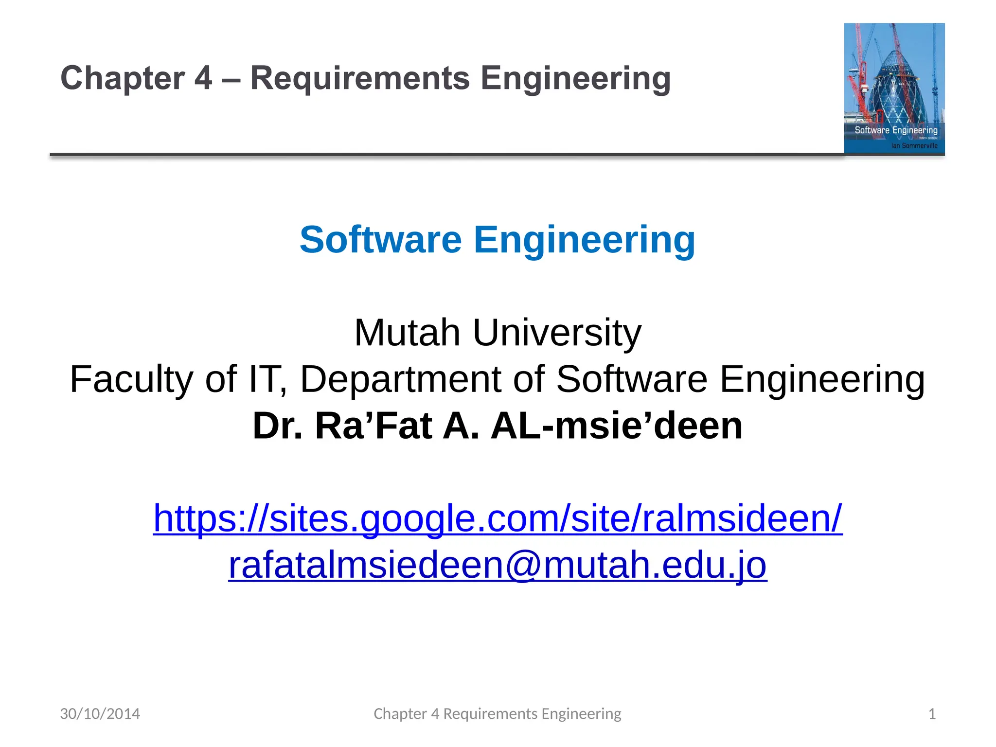 Chapter 4 of the document focuses on requirements engineering, defining it as the process of establishing the services and constraints of a system based on customer needs. It covers various topics including the types of requirements, the elicitation and validation processes, and the difference between functional and non-functional requirements. The chapter also emphasizes the importance of stakeholder involvement and the iterative nature of requirements engineering as a critical activity in software development.