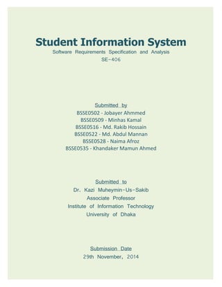 The document summarizes the inception phase of requirements engineering for developing a Student Information System for the Institute of Information Technology at the University of Dhaka. Key activities in the inception phase included identifying stakeholders such as students, faculty, administrators and alumni; eliciting their requirements through discussions; identifying common and conflicting requirements; and prioritizing requirements to develop an initial set of requirements for the system.