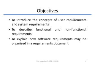 The document discusses software requirements and requirements engineering. It introduces concepts like user requirements, system requirements, functional requirements, and non-functional requirements. It explains how requirements can be organized in a requirements document and the different types of stakeholders who read requirements. The document also discusses challenges in writing requirements precisely and provides examples of requirements specification for a library system called LIBSYS.