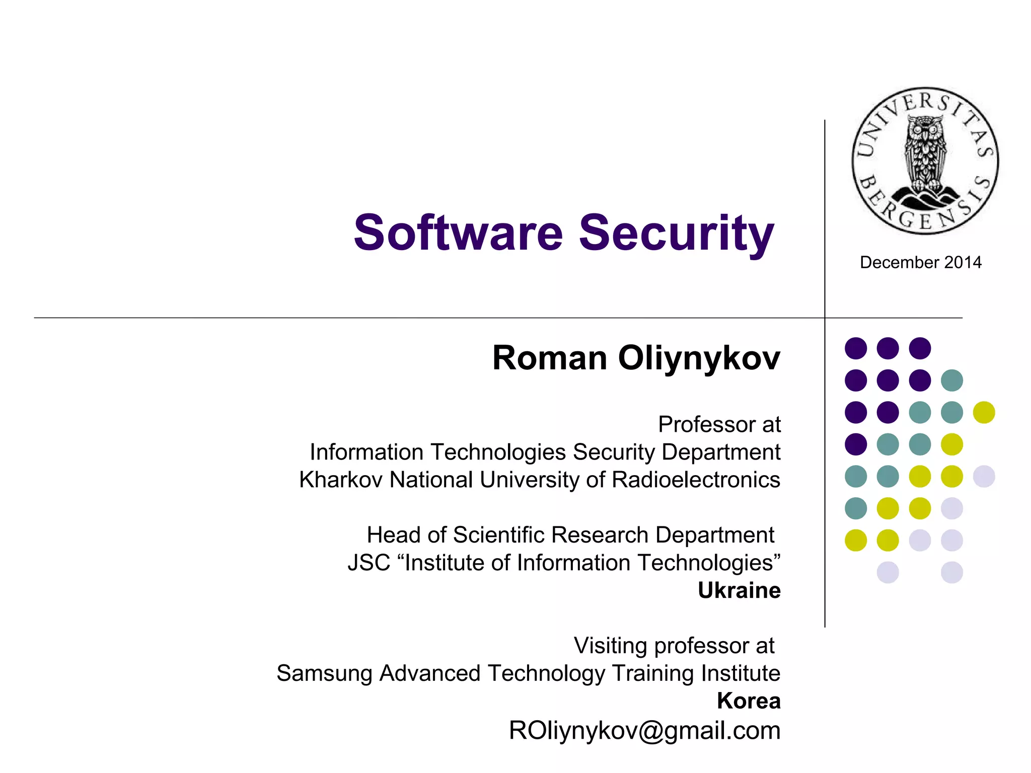 This document provides an outline for a lecture on software security. It introduces the lecturer, Roman Oliynykov, and covers various topics related to software vulnerabilities like buffer overflows, heap overflows, integer overflows, and format string vulnerabilities. It provides examples of vulnerable code and exploits, and recommendations for writing more secure code to avoid these vulnerabilities.