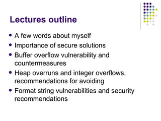 This document provides an outline for a lecture on software security. It introduces the lecturer, Roman Oliynykov, and covers various topics related to software vulnerabilities like buffer overflows, heap overflows, integer overflows, and format string vulnerabilities. It provides examples of vulnerable code and exploits, and recommendations for writing more secure code to avoid these vulnerabilities.