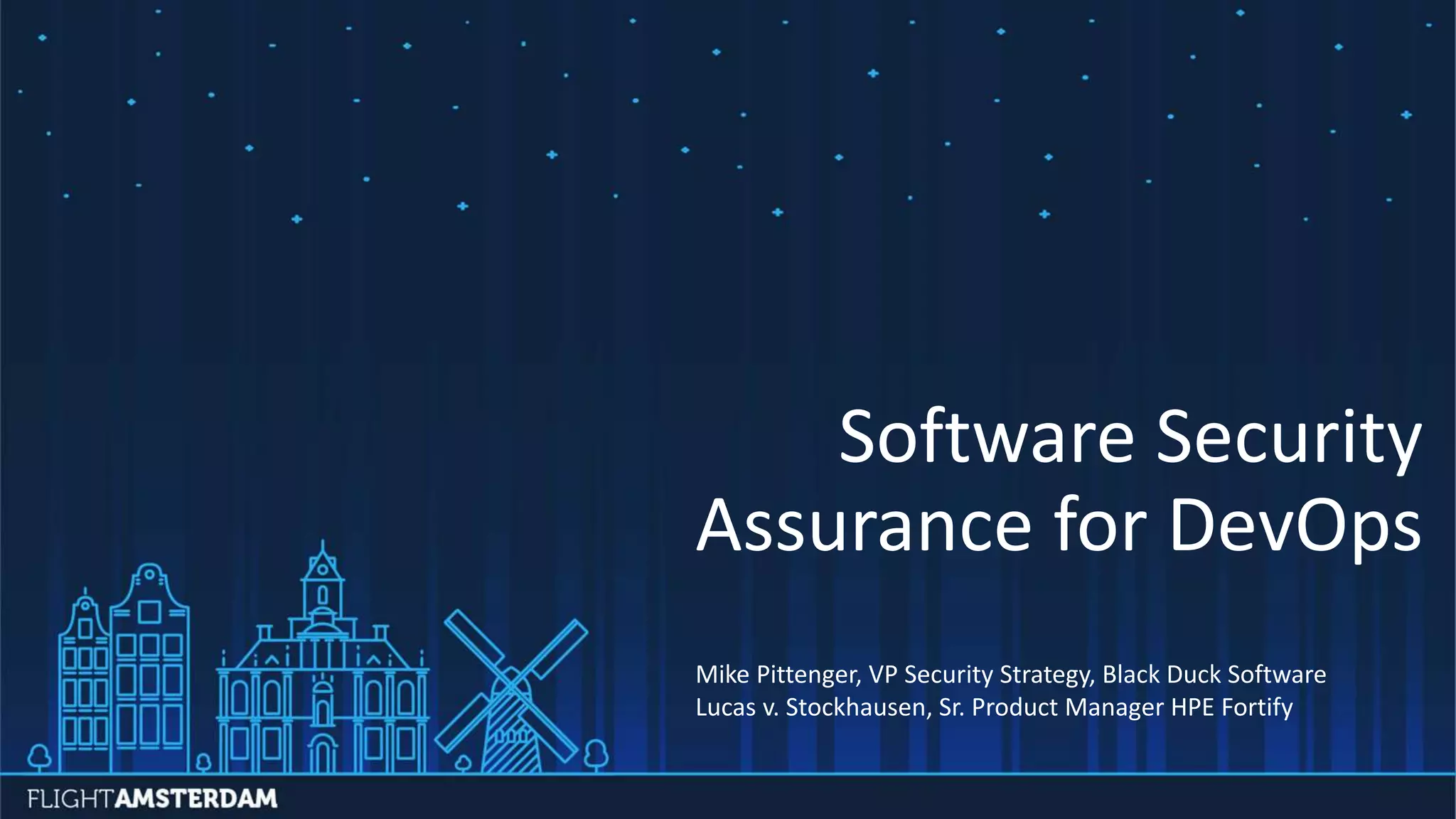 The document discusses the challenges and strategies related to software security assurance in DevOps, highlighting the growing integration of open source and custom code. It emphasizes the importance of automated security testing and robust governance policies in managing security risks across both types of code. The partnership between HPE Security Fortify and Black Duck aims to enhance visibility and remediation of security vulnerabilities in software development processes.