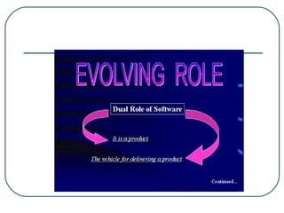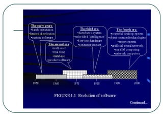 This document introduces software engineering and discusses some key concepts. It defines software engineering as a systematic approach to software development, operation, and maintenance. The goal of software engineering is to produce high-quality software products through defined processes. However, software development faces challenges like inability to build programs fast enough to meet demand. The document also discusses common misconceptions around software, such as the belief that more programmers can catch up on a late project. It identifies poorly defined requirements as a major cause of failed software projects. Finally, it notes problems like lack of data collection and customer dissatisfaction that demonstrate the need for a systematic approach like software engineering.