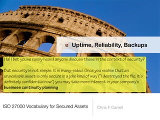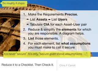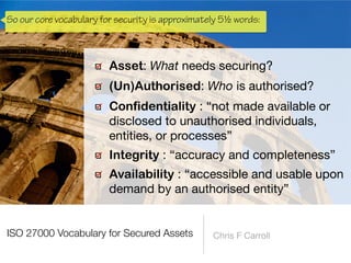 The document discusses a framework for thinking about security in software architecture, emphasizing the need to ask critical questions regarding what needs to be secured, who the security is for, and what 'secure' means in terms of confidentiality, integrity, and availability. It also outlines the importance of a common vocabulary and highlights the continuous nature of managing security, suggesting the establishment of an information security management system for ongoing compliance and risk management. The author advocates for a structured approach to identify and protect information assets while simplifying the design process.