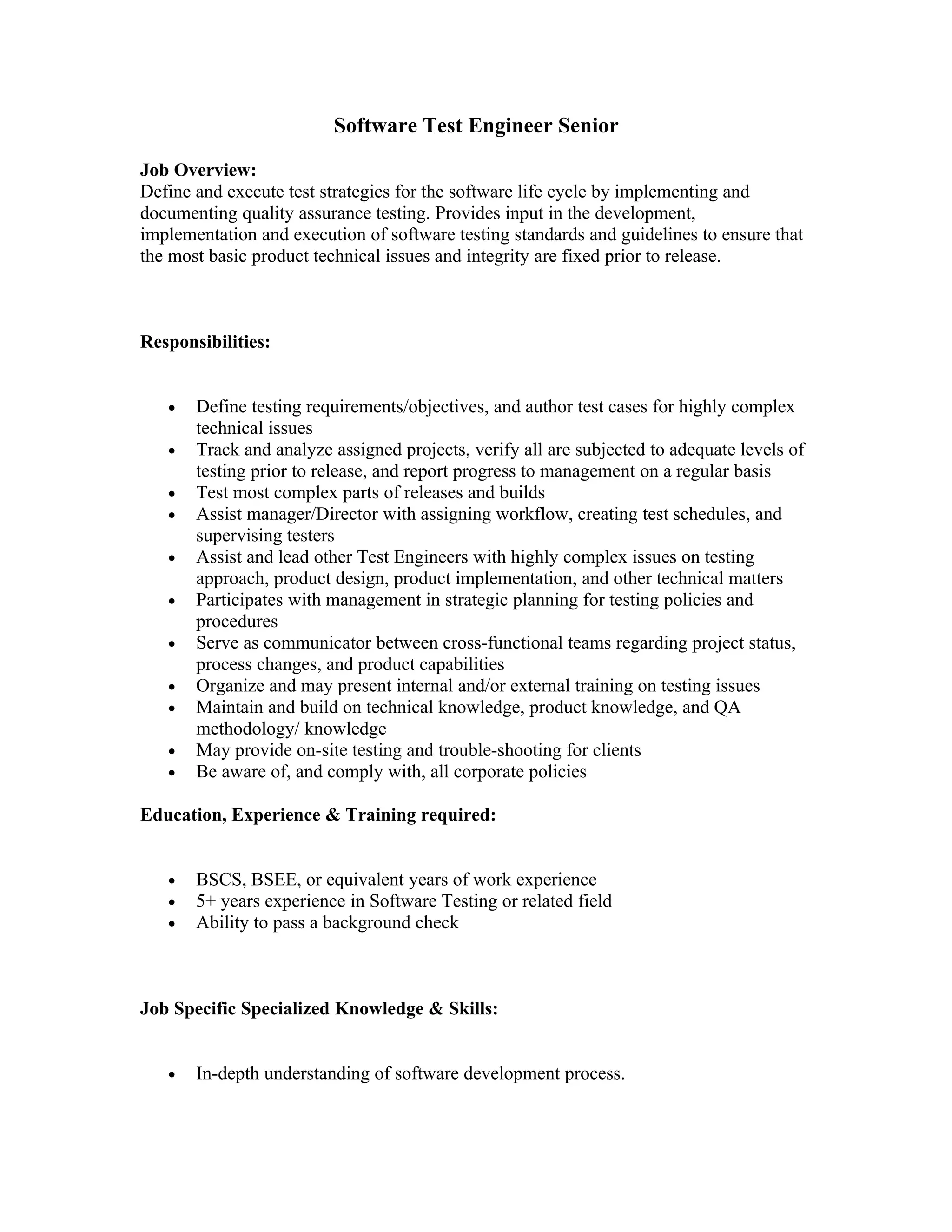 This job posting is for a Senior Software Test Engineer position. The responsibilities include defining testing requirements, authoring test cases for complex issues, tracking project testing, assisting other testers, and participating in strategic planning. A bachelor's degree in computer science, software engineering, or related field is required along with 5+ years of software testing experience and expert knowledge of QA processes and methodologies.