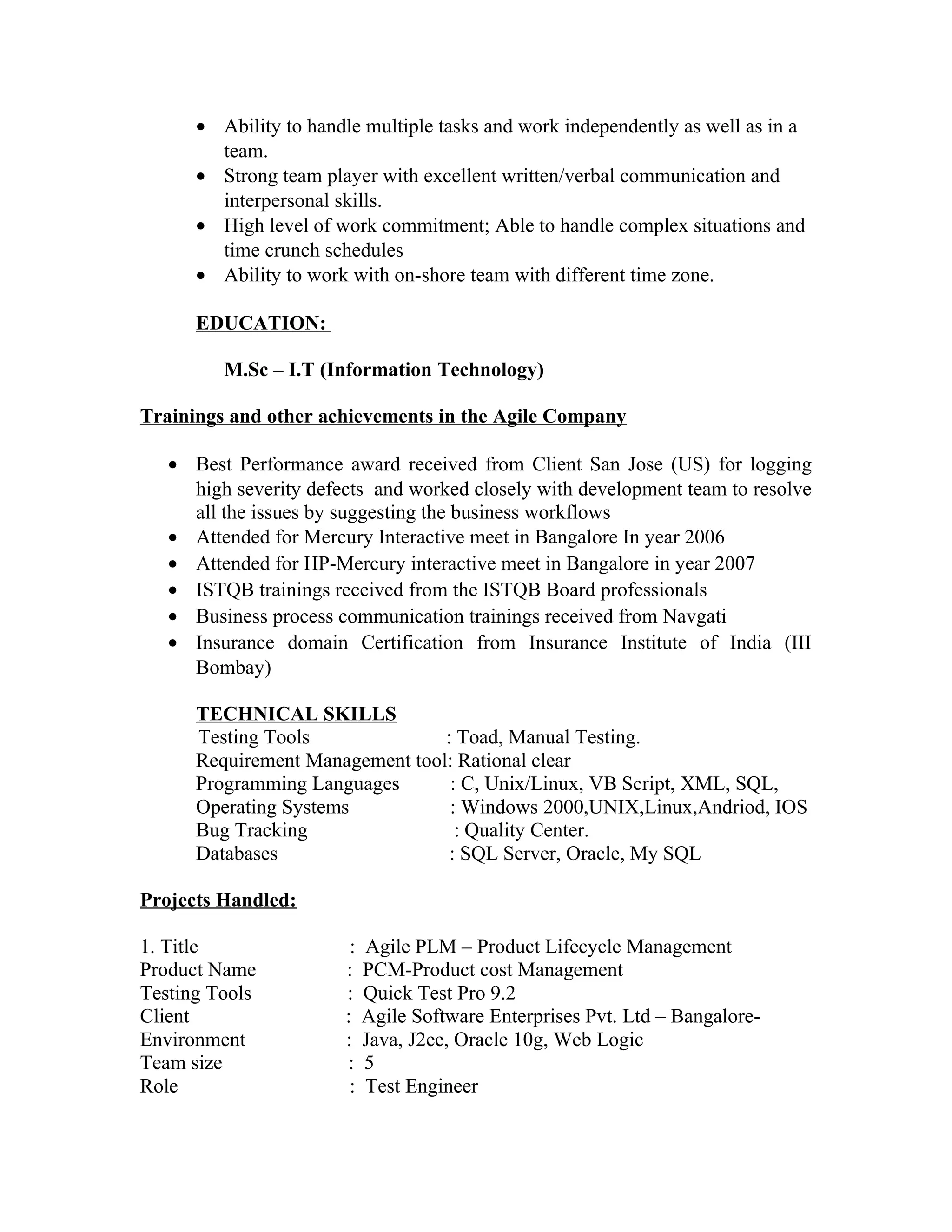 Vijaya Lakshmi has over 3.6 years of experience in software testing and quality assurance. She has worked as a senior software test engineer and test engineer for various companies testing applications in domains such as product lifecycle management, insurance, and administration tools. She has experience in all phases of testing including requirements analysis, test case design, execution, defect tracking, and reporting. Vijaya Lakshmi is proficient in testing methodologies, tools, and programming languages. She is looking for new opportunities as a QA/test engineer.