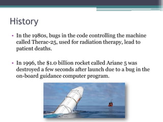 The document outlines the history and importance of software testing, detailing its necessity in identifying defects, ensuring reliability, and delivering quality products. It discusses various types of testing methodologies, such as functional, non-functional, and performance testing, along with quality assurance and control. The document also covers testing strategies, including agile and waterfall methodologies, emphasizing the continuous evolution of testing practices to meet the demands of software development.