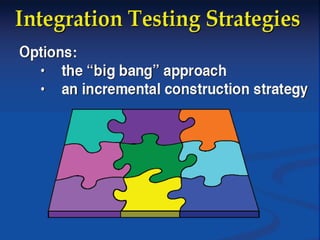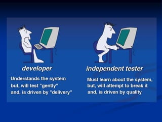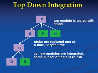 This document discusses various software testing methodologies. It begins by defining software testing and its objectives. It then covers topics like verification and validation, unit testing, integration testing strategies, validation testing, system testing types, and software testing strategies. The remainder of the document focuses on different types of testing like white-box testing, black-box testing, and grey-box testing along with techniques like structural testing, code coverage, equivalence partitioning, and boundary value analysis.