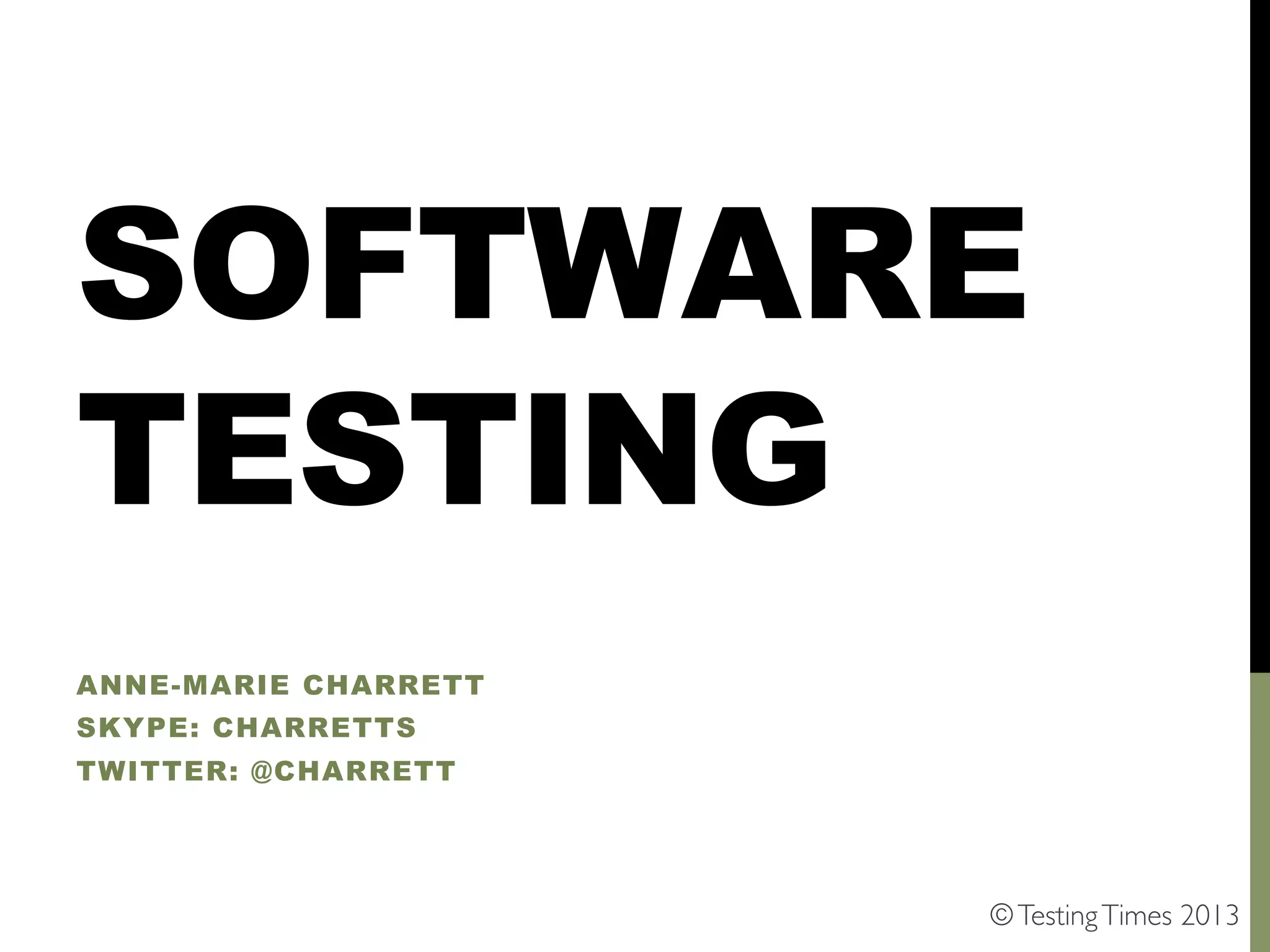This document discusses software testing and provides guidance on best practices. It defines software testing as empirically investigating a product to provide stakeholders with quality information. The key aspects of testing discussed are modeling the system, making observations, asking useful questions, using logical reasoning, and taking a process of discovery approach. Testing is distinguished from checking and the importance of test design, exploratory testing, and testability over large automated test suites is emphasized. Credits are given to influential thinkers in the field.