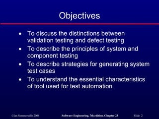 The document discusses various types of software testing including system testing, component testing, test case design, and test automation. It describes the differences between validation testing and defect testing. Key points covered include testing at the system and component level, generating test cases, black-box and structural testing approaches, and guidelines for interface and integration testing.