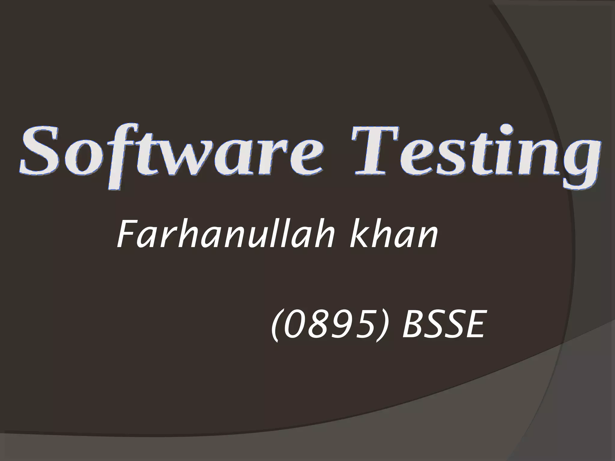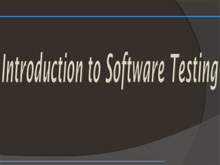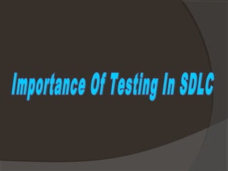 The document discusses various types of software testing that take place during the software development life cycle (SDLC). It defines key terms like bugs, faults, and failures. It then explains different types of testing like unit testing, system testing, usability testing, functional testing, security testing, alpha testing, acceptance testing, beta testing, regression testing, and monkey testing. The overall purpose of software testing is to identify issues, ensure quality, and validate that requirements are met before releasing the software to end users.