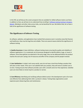 The document discusses the importance and growing demand for software testing in various sectors, emphasizing the critical nature of quality assurance in ensuring reliable software products. It outlines several prominent career opportunities in the field, including roles such as software tester, test automation engineer, performance tester, security tester, and quality assurance manager. Additionally, it highlights the significance of receiving training and certification to enhance skills and career prospects in software testing.