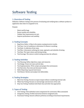 Software Testing is a critical process in the software development lifecycle (SDLC) that involves evaluating and verifying that a software application or system performs as expected. It ensures the quality, functionality, performance, and security of the software before it is released to users. The primary goal of testing is to identify and eliminate defects or bugs to improve the software's reliability and user satisfaction.