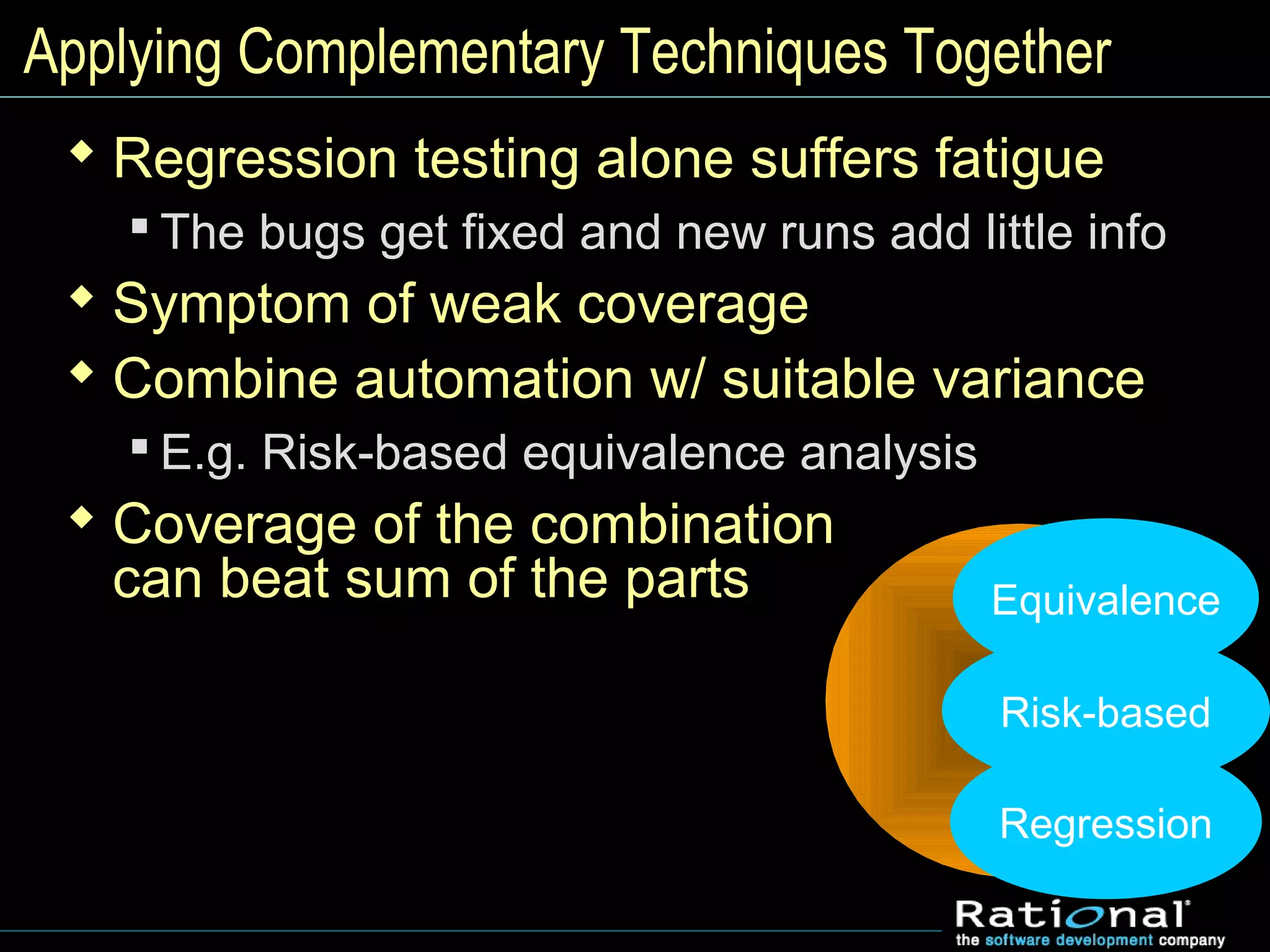 Regression testing alone is insufficient and suffers from fatigue over time as bugs are fixed but new runs provide little additional information. To improve test coverage and effectiveness, complementary techniques should be combined, such as combining automation with risk-based equivalence analysis. The coverage achieved by combining techniques can exceed the sum of using each technique individually. When adopting new techniques, organizations should determine their current test approach and weaknesses, identify a practical and risk-focused additional technique to address shortcomings, and apply the new technique until proficiency is achieved through iteration.