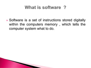 The document discusses different types of software testing. It states that software testing is a process that verifies that a system meets requirements and finds errors. There are two main types of testing: whitebox testing, where internal code structure is known, and blackbox testing, where it is unknown. Whitebox testing is used for verification while blackbox testing is used for validation from an end user perspective. The document also outlines various stages of testing like unit testing, integration testing, and functional testing.