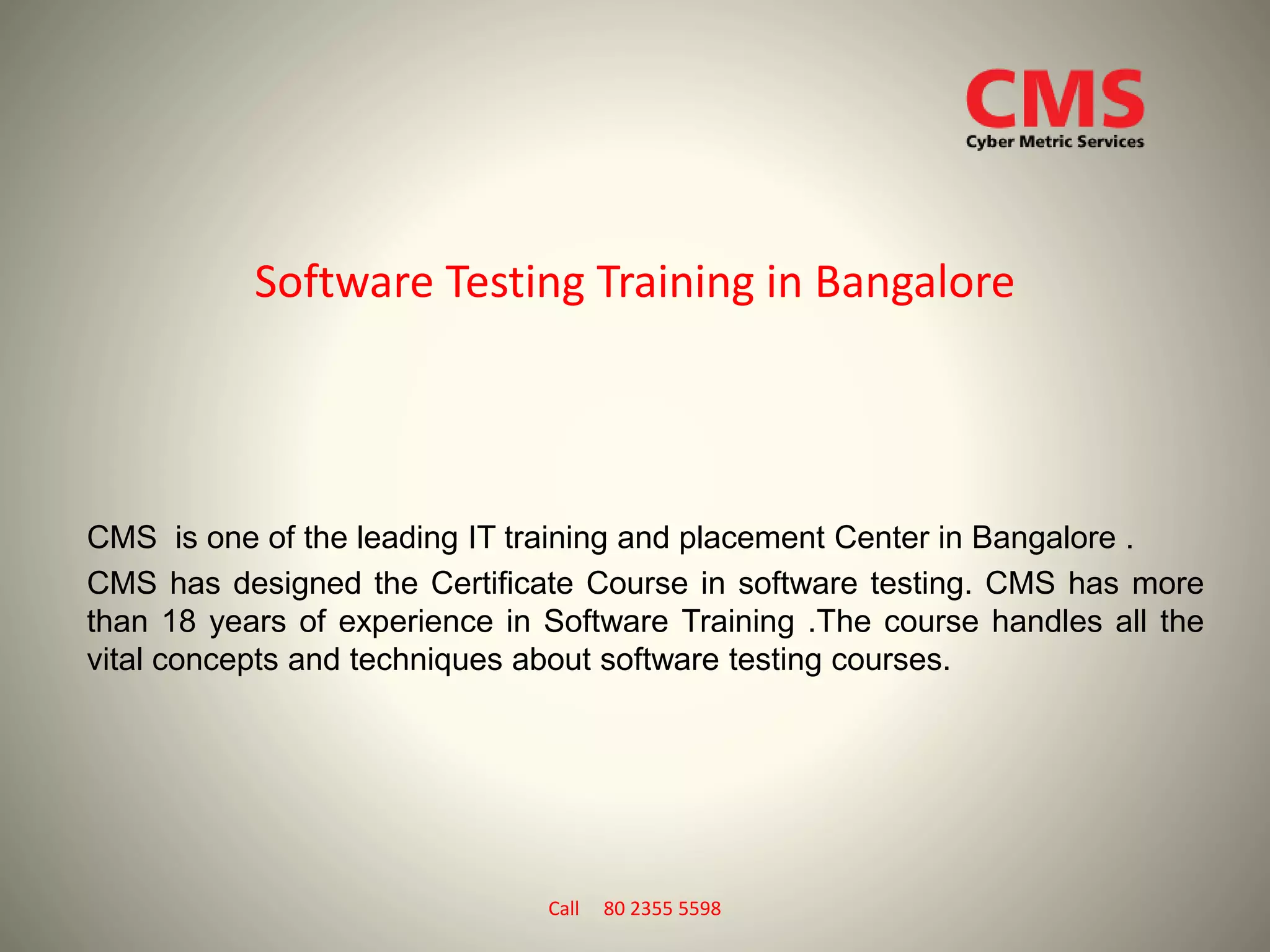 Cyber Metric Services (India) Pvt. Ltd. offers software testing training in Bangalore, with over 18 years of experience in IT training and placement. The certificate course covers essential software testing concepts and various testing techniques, including QTP and Selenium automation testing. Additionally, CMS provides placement assistance through its extensive industry network and experienced instructors.