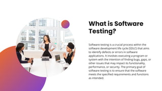 Software testing is a vital process in the software development life cycle aimed at identifying defects to ensure functionality, performance, and security. Key testing types include functional, performance, security, usability, integration, regression, and unit testing, each serving unique objectives in enhancing software quality and reliability. Benefits of software testing encompass improved quality, cost savings, risk mitigation, enhanced user experience, and compliance with industry standards, making it essential for successful software deployment.