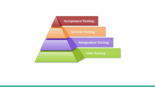 The document discusses different types of software testing including manual testing techniques like white box, black box and grey box testing. It also discusses automated testing like unit testing, integration testing, system testing, functional testing, non-functional testing types like performance, load, stress, scalability, stability and usability testing. Compatibility testing is also discussed which checks if the software works across different platforms and environments.