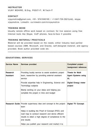 Vijay Mohire provides educational services such as research assistance, research guidance, research support, and concept development. He has a B.Eng in Electronics and Communication, a PGDIT-IT, and an M.Tech-IT. He trains in areas like computer engineering, IT subjects, and business administration using materials from IBM, Microsoft, Oracle or self-designed content. His training is usually remote but can include face-to-face sessions using tools like Skype.