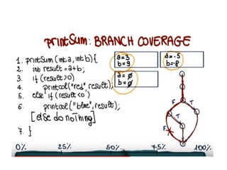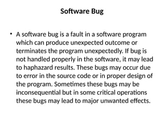 The document outlines various software testing techniques, categorizing software bugs and their potential impacts on programs. It discusses the importance of testing activities, different methodologies such as black-box and white-box testing, as well as specific techniques like boundary value analysis and error guessing. Additionally, it covers the stages of testing including alpha and beta testing, as well as the significance of both functional and non-functional testing in ensuring software quality.