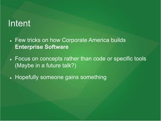 The document provides an overview of software development methodologies and best practices used in corporate America. It discusses waterfall and agile methodologies, emphasizing agile's benefits like constant delivery of small features, transparency, and adaptability. It also covers topics like source control using Git, code quality practices like testing and code reviews, and considerations for applying agile principles in a research lab setting.