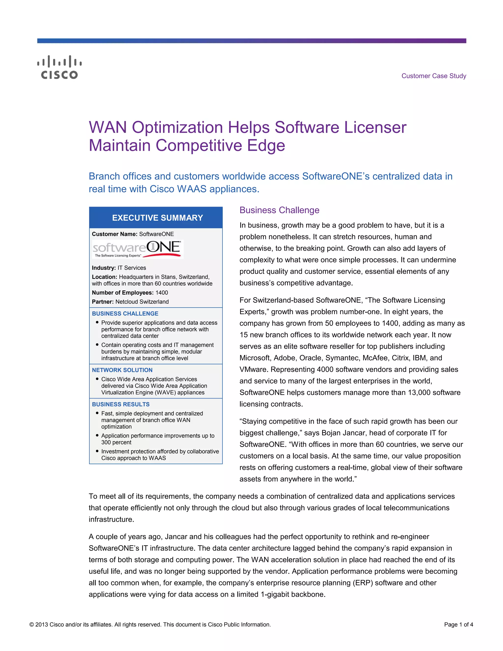SoftwareOne, an IT services company based in Switzerland, faced challenges due to rapid growth and needed a solution to improve application performance and manage costs at its numerous branch offices. They implemented Cisco's Wide Area Application Services (WAAS) to optimize performance, resulting in up to 300% improvement in application accessibility and significant savings in both deployment and operating expenses. The new infrastructure enabled real-time data access for clients and solidified SoftwareOne's competitive advantage in the software licensing industry.