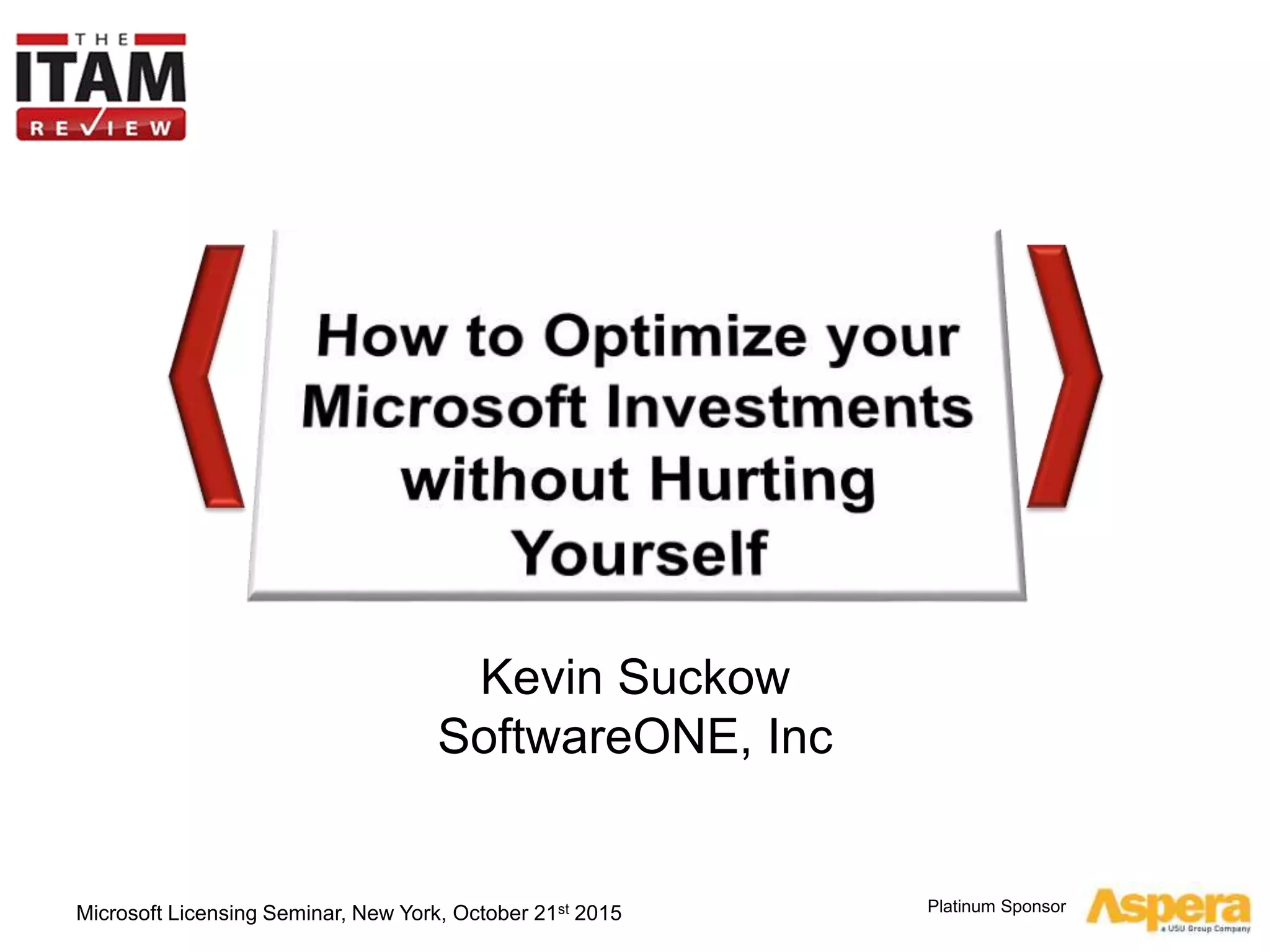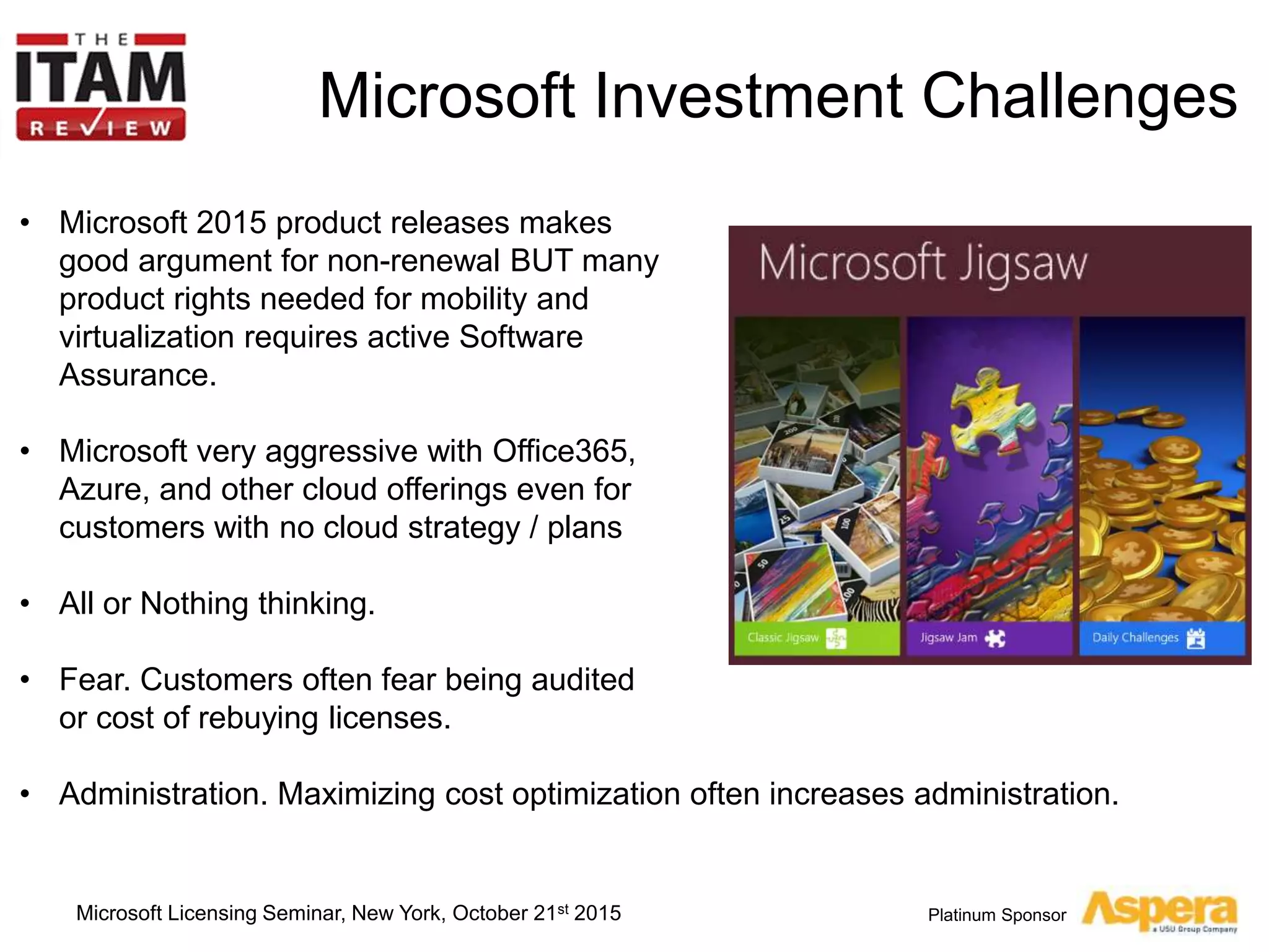 The document summarizes key insights from a Microsoft licensing seminar held in New York, focusing on challenges and strategies for optimizing Microsoft spend. It discusses various licensing options, including Office 365, Azure, and SQL, emphasizing the importance of early planning and assessment. Recommendations include understanding licensing intricacies and being open to multiple licensing programs to control costs effectively.