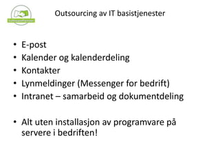 Outsourcing av ITbasistjenesterE-postKalender og kalenderdelingKontakterLynmeldinger (Messenger for bedrift)Intranet – samarbeid og dokumentdelingAlt uten installasjon av programvare på servere i bedriften!