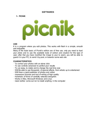 Picnik is a free online photo editing program that allows users to easily correct, enhance, and share photos directly from their web browser without needing to download or install any software. It features basic editing tools as well as advanced controls and thousands of effects and templates. Word is a word processing program included in the Microsoft Office suite that enables users to create all types of written documents. It offers formatting and layout options like page margins and numbering, fonts and styles, images, tables, form letters, and a print preview.