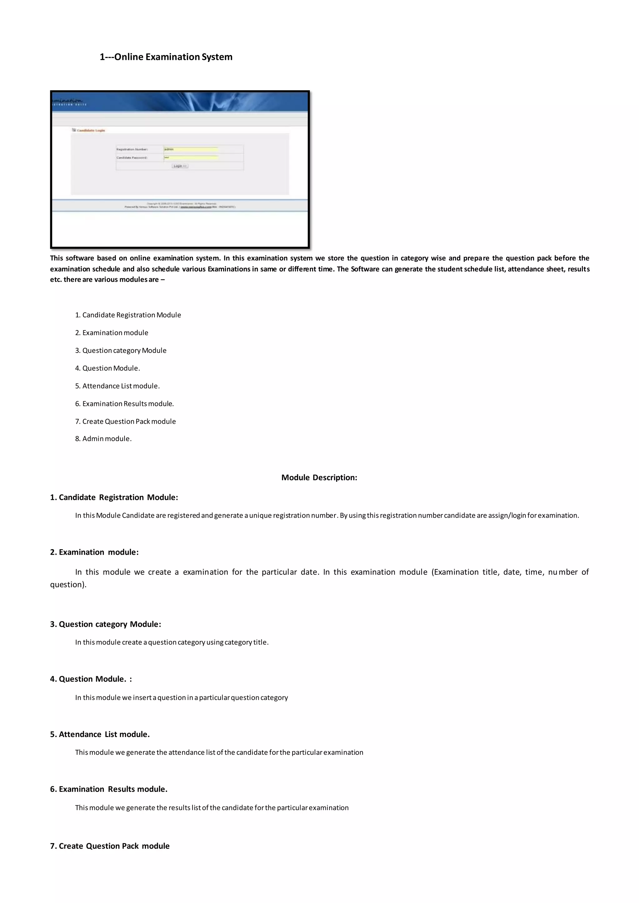 This document describes an online examination system software with multiple modules. The key modules allow administrators to store questions by category, schedule examinations, generate student schedules and attendance sheets, and view results. Students can register for exams and are assigned a unique registration number. Examinations can be created with details like title, date, time, and number of questions. The system also includes modules to create question packs for exams and manage administrative information.
