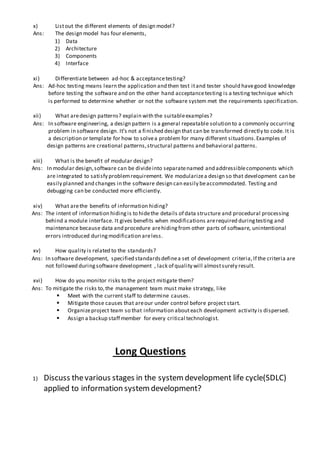 The document provides definitions and explanations of key software engineering concepts. It summarizes stakeholders as anyone who directly or indirectly benefits from a system. Prototyping draws criticism for prioritizing quick prototypes over quality. Incremental development delivers software in pieces that build on prior deliveries, while evolutionary development iteratively produces more complete versions. Formal methods are not widely used due to extended timelines, complex mathematics, and incompatibility with other tools. Risk analysis identifies possible losses in development. Information systems link to business objectives by improving processes and maintaining competitive advantages. Process improvement involves measurement, analysis, change identification. Requirements elicitation uses techniques like interviews and prototyping. Architecture design represents effectiveness and reduces risks. Modular design improves
