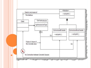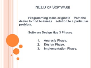 This document discusses software design and the need for design patterns. It covers the three phases of software design: analysis, design, and implementation. It then discusses what design patterns are, providing the definition that they are standard solutions to common programming problems. The document outlines the three main categories of design patterns: structural, creational, and behavioral. It provides examples like the factory pattern, explaining how it works to reduce dependencies and improve flexibility. In summary, the document introduces software design processes and argues that using design patterns provides benefits like improved code reuse and developer communication.