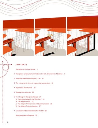 The document outlines the concept of 'disruption' in various industries, emphasizing that organizations must adapt to rapid technological changes to avoid being outpaced by lean startups and innovative new entrants. It discusses how traditional institutions like the New York Times and the Pentagon are struggling to innovate in the face of disruptive technologies, which presents significant challenges for established players. The text invites participation in a research initiative aimed at exploring design strategies to effectively harness disruption and promote innovation.