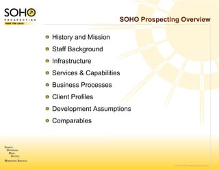 SOHO Prospecting provides services including corporate branding, website development, and internet marketing. They have a team of experienced marketing professionals and develop projects using a phased approach with client input. SOHO aims to help clients increase market share through search-optimized strategies and works with companies across various industries.