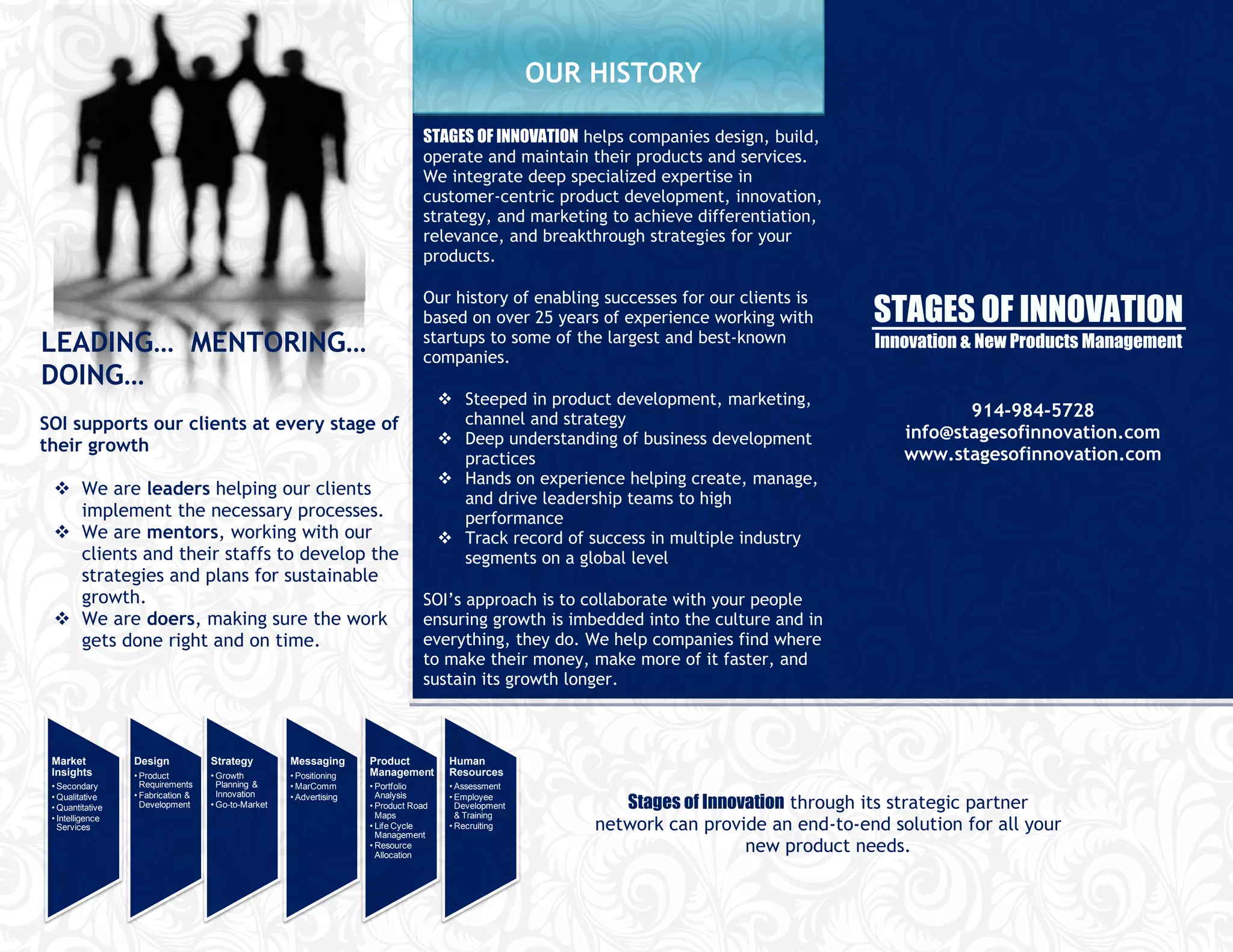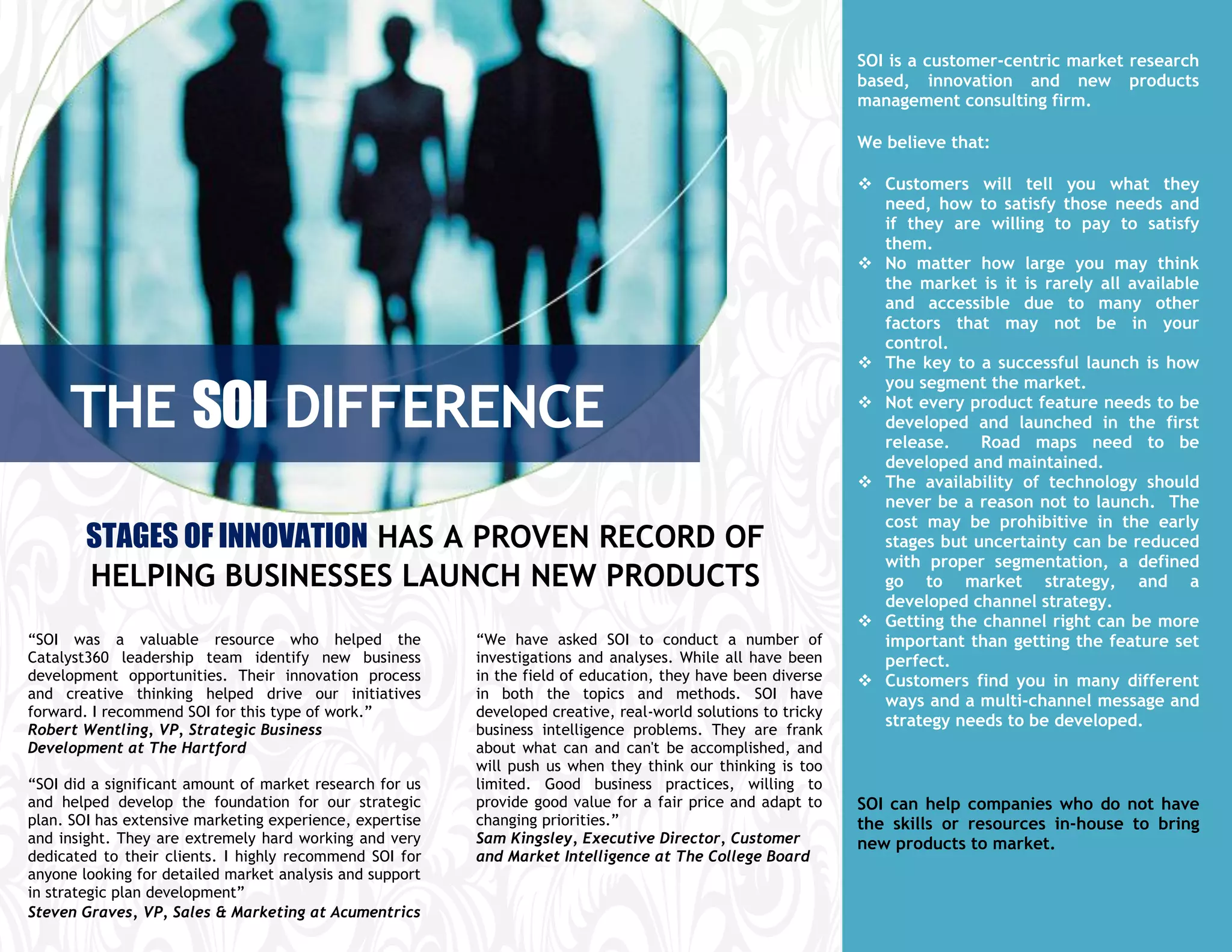 Stages of Innovation (SOI) is a consulting firm with over 25 years of experience in product development, marketing, and strategy, helping clients achieve sustainable growth through customer-centric innovation. SOI provides end-to-end solutions for new product development, emphasizing the importance of market segmentation and effective go-to-market strategies. Their approach includes collaboration, hands-on mentorship, and a proven track record of success across various industries.