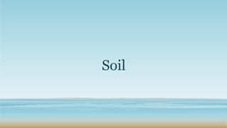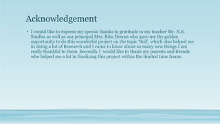 The document discusses different types of soil found in India. It begins by thanking those who helped with the soil project. It then provides information on soil formation and describes the major soil types in India - alluvial, black, red and yellow, laterite, forest/mountain, and arid soils. For each soil type, it discusses characteristics, location, and crops grown. In total, six major soil types are described that cover different percentages of India's total land area. The document concludes with information on soil erosion and conservation methods.