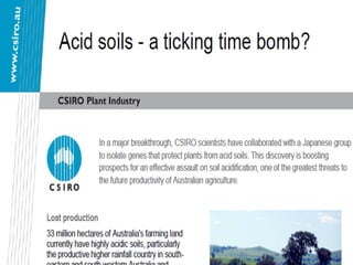 This document discusses soil acidity and pH. It begins by explaining how various natural and anthropogenic factors can contribute to soil acidity in humid regions. It then discusses how pH impacts nutrient availability and toxicity, with most nutrients being optimally available between pH 5.5-7. It also covers aluminum toxicity, how it is more prevalent at lower pH, and how different crop varieties have varying sensitivities. The document provides an overview of the multiple forms of soil acidity and explains pH in terms of hydrogen ion concentration.