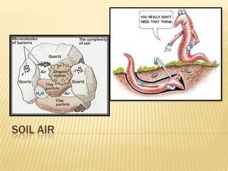 This document discusses soil air and aeration. It notes that soil air is important for root respiration and decomposition by microorganisms. Well-aerated soil allows for rapid oxygen exchange between the soil and atmosphere. Factors like pore space, temperature, depth, and wetting/drying influence gas exchange rates. Pore space occupies the volume not taken up by solids and is made up of spaces between aggregates and those created by roots, microbes, and expanding gases. Pore size and soil texture impact aeration. Aeration is the replacement of soil air by atmospheric air through diffusion and mass flow. Poor aeration can result from excess moisture or slow gas exchange. Improving drainage, tillage, and adding