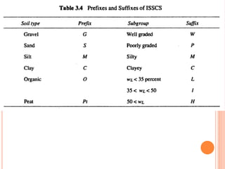 The Indian Standard Soil Classification System classifies soils into 18 groups based on particle size and composition. Soils are divided into three broad divisions: coarse-grained soils subdivided into 8 groups, fine-grained soils subdivided into 9 groups, and peat which is its own group. Coarse-grained soils are those where 50% or more of the material is retained on a 75 micrometer sieve. Fine-grained soils are those where more than 50% of the material passes a 75 micrometer sieve. The system further classifies soils based on gradation and the presence of silt or clay fines.