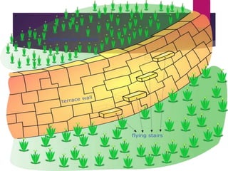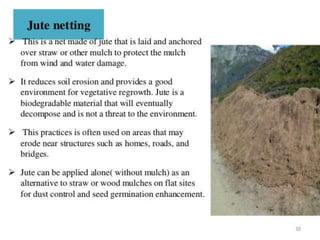 This document discusses various techniques for soil conservation to prevent erosion and maintain fertility. It describes contour plowing, terrace farming, keyline design, perimeter runoff control, windbreaks, crop rotation, and mulching as organic farming practices that conserve the soil. It also recommends preventing overgrazing, re-establishing forest cover, and maintaining soil pH levels. The document concludes by mentioning engineering structures like gabion walls, retaining walls, breast walls, check dams, and weep holes that can further control soil erosion.