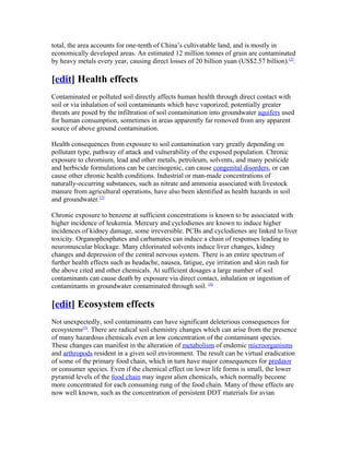Soil contamination is caused by chemicals from industrial activities such as underground storage tank ruptures, pesticide application, and landfill leaching. Common contaminants include petroleum, solvents, heavy metals, and pesticides. Mapping and cleaning contaminated sites is expensive and time-consuming. Health risks from contaminated soil include direct contact, vapor inhalation, and groundwater contamination. Ecosystems are also negatively impacted through changes to soil chemistry and the food chain. Cleanup options involve excavating soil, treating it on-site through aeration, heating, or bioremediation, extracting groundwater or vapors, containment, or phytoremediation using plants.
