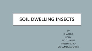 This document discusses soil-dwelling insects and their roles in ecosystems. It notes that soils provide habitat for many insect specimens and that insects play important roles as predators, prey, and in nutrient cycling. Significant soil-dwelling insect orders mentioned include Diptera (flies), whose larvae impact decomposition, and Formicidae (ants), which as a family are possibly the most significant soil insects due to their worldwide numbers, diversity, biomass, predatory nature, and social colony structures.