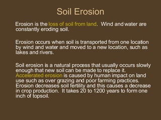Soil erosion is caused by both natural processes like wind and water, as well as human activities such as deforestation, overgrazing, monoculture farming, and removing windbreaks. This accelerated erosion decreases soil fertility and crop production. Several methods can limit soil erosion, including terracing to hold soil and water, contour ploughing across slopes, planting shelter belts to protect soil, using strip farming to minimize bare soil, and installing stone lines along contours to reduce runoff.
