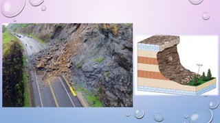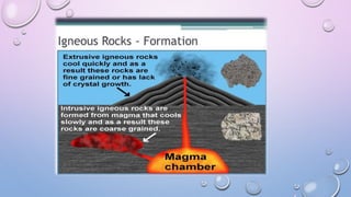 Soil is formed through the weathering of parent material such as bedrock. There are different types of parent material including residual material composed of igneous, sedimentary, and metamorphic rocks still located where they were formed. Transported parent material has been moved from its origin by forces like water, wind, glaciers or gravity. Soil formation breaks down parent material through weathering and adds organic matter over time to create distinct soil horizons capable of supporting plant growth.