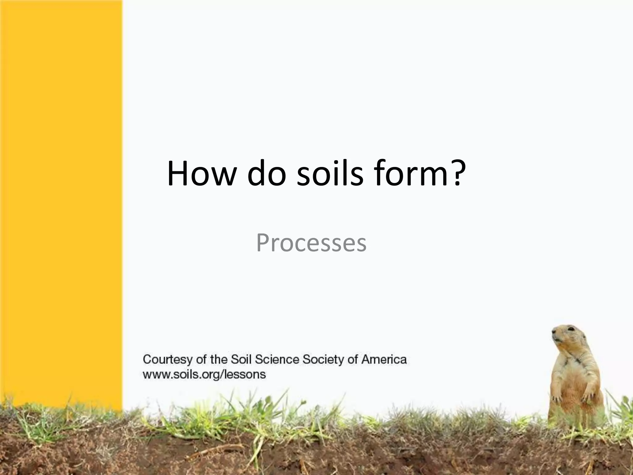 Four main processes shape soil formation: additions, losses, translocations, and transformations. Additions include water, minerals from dust, organic matter and nutrients from animal waste and fertilizer. Losses occur through evaporation, water runoff, and decomposition of organic matter. Translocations involve the movement of materials within the soil by gravity, evaporation, and organisms. Transformations change one component into another through processes like decomposition of leaves into humus or weathering of rock into clay. Over time, these processes cause the soil to change significantly from its original parent material in both composition and appearance.