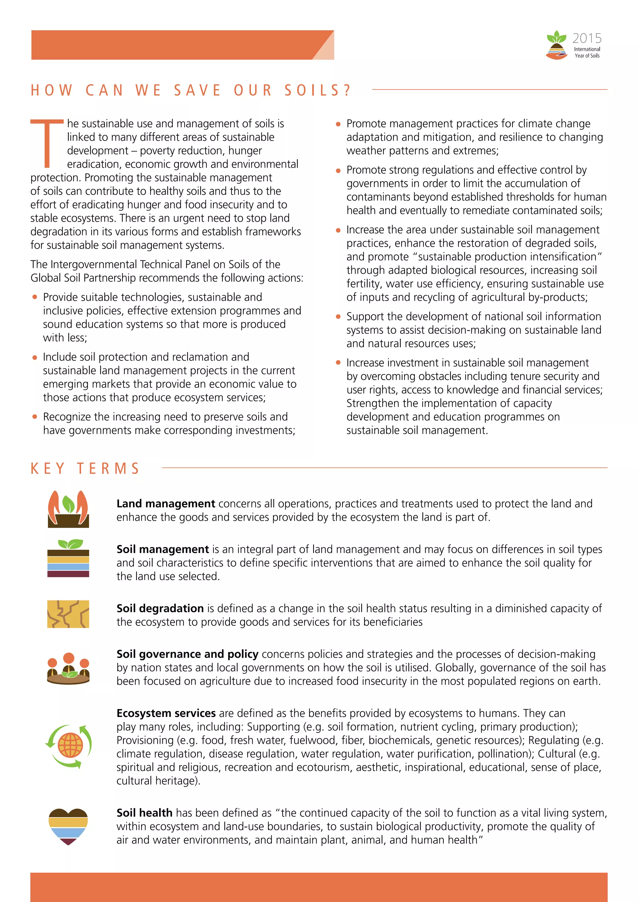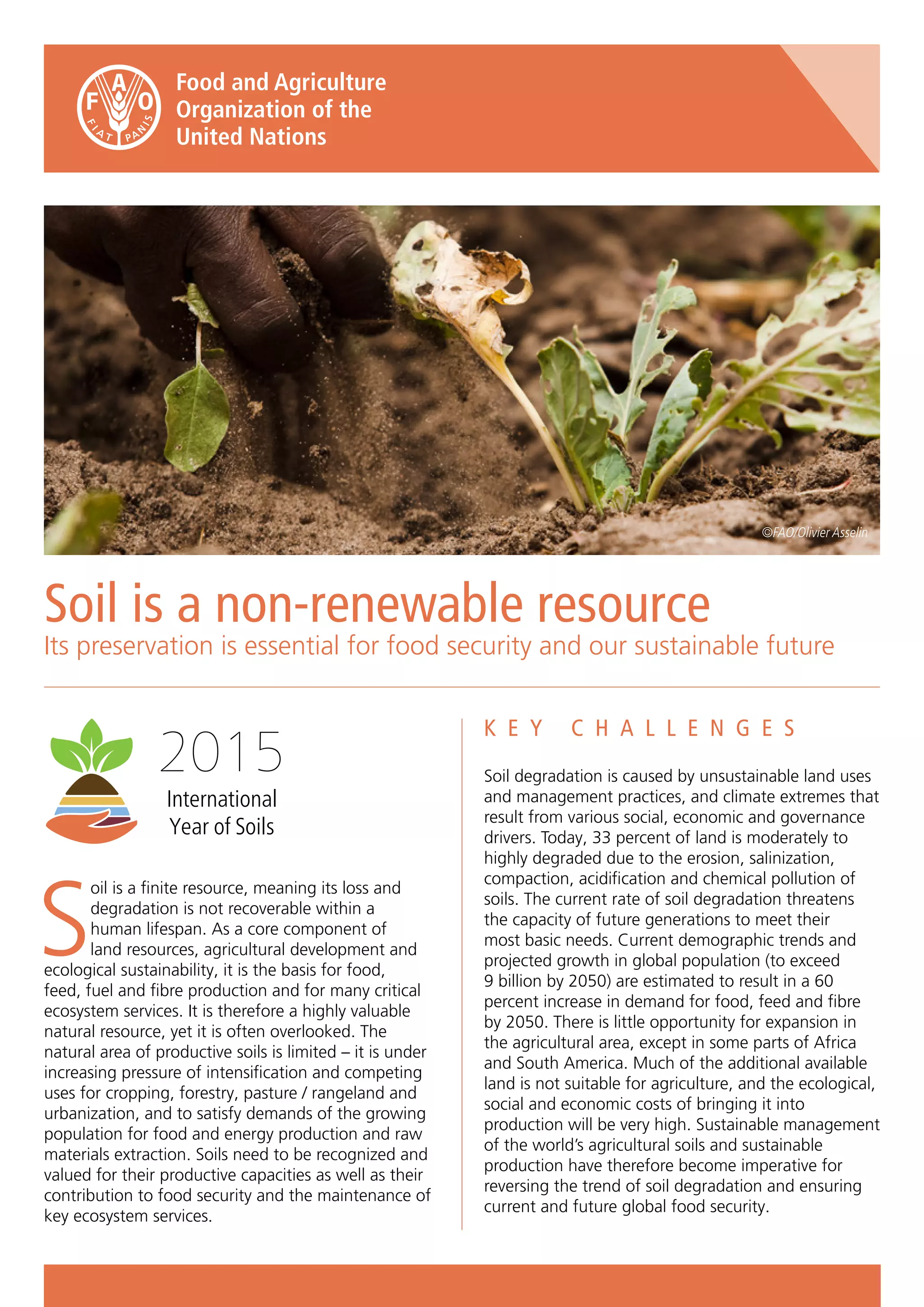 The document discusses key challenges related to soil preservation and sustainable management. It notes that soil is a non-renewable resource under increasing pressure from population growth and competing land uses. Approximately one third of global land is currently degraded. Sustainable soil management is imperative for reversing degradation trends and ensuring future global food security given limited opportunities for agricultural expansion. The document outlines recommendations for promoting sustainable soil practices including technologies, policies, education, and investment to increase production while using less land and inputs.