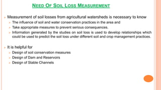 The document discusses the necessity and techniques for measuring soil loss in agricultural watersheds, emphasizing the importance of such measurements for soil and water conservation practices. It details various methods including runoff plots and sediment samplers for assessing soil erosion and informs on the types and designs of these plots. Additionally, it addresses the merits and demerits of runoff plots and explains two specific sediment sampling methods: multislot divisor and coshocton wheel sampler.